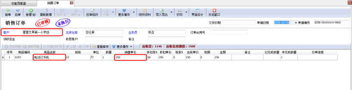 設置完成之后,在功能導航窗點擊“銷售管理”——》“銷售訂單”,新增銷售訂單,客戶“星星文具第一小學店”需要訂購商品“電動訂書機”,銷售單價為150元。如下圖二所示。