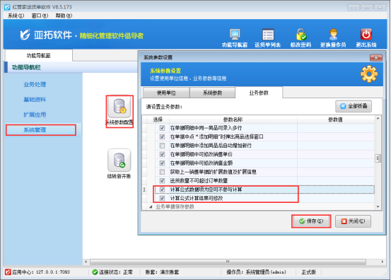 設置可修改由計算公式得出的計算結果過程:首先在“系統管理”—》“系統參數配置”勾選相應的業務參數并保存配置,具體如下圖所示: