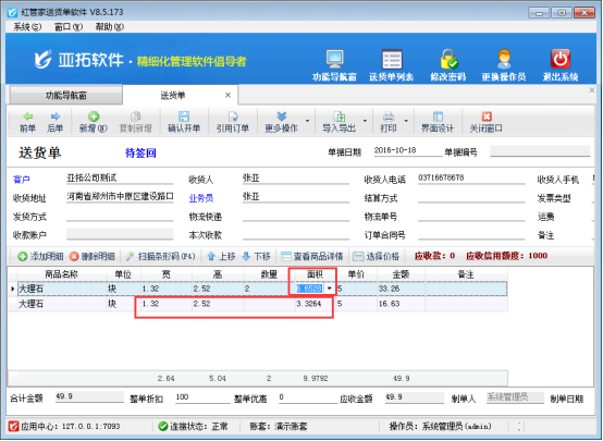 對于不同的商品都能夠使用軟件開單計算,亞拓軟件下的送貨單軟件亞拓管理軟件等都支持可在開單界面設置擴展數值來支持計算公式的使用,比如有些商品需要寬乘高來計算面積。為了使客戶對于計算公式的計算結果更便捷使用,軟件可設置修改由配置計算公式得的計算結果。