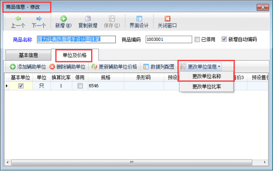 打開商品信息選擇商品點擊修改按鈕,選擇單位及價格,進入單位及價格界面。點擊“更改單位信息”的更改單位名稱。具體步驟如下圖展示:
