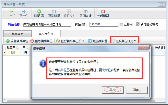點擊“是”可以進行修改單位名稱,示例中是把單位“只”修改為“個”,修改后顯示為: