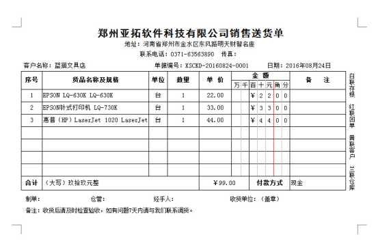 保存成功后,再查看單據(jù)打印預(yù)覽效果如下圖所示,使用單位顯示為:亞拓軟件