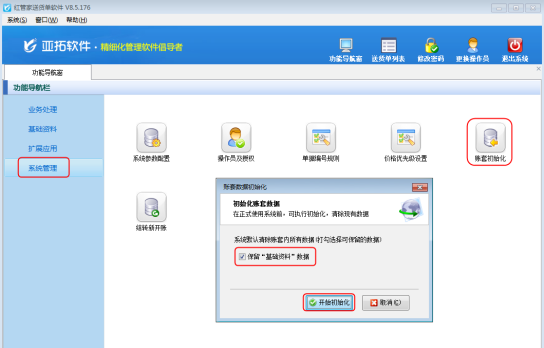 默認初始化會刪除所有業(yè)務單據(jù),我們可以根據(jù)自己的實際需要去選擇需要保留和刪除“基礎資料”,可打勾選擇要保留的數(shù)據(jù)內(nèi)容。點“開始初始化”按鈕等待軟件執(zhí)行完成即可,如下圖2所示。