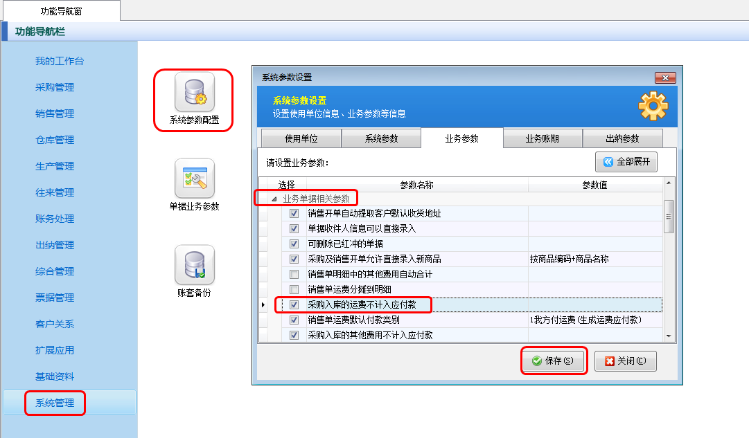 在功能導航窗點擊“系統(tǒng)管理”—》“系統(tǒng)參數(shù)配置”—》“業(yè)務(wù)參數(shù)”,即可進入到“業(yè)務(wù)參數(shù)”配置界面,在業(yè)務(wù)單據(jù)相關(guān)參數(shù)內(nèi)打勾啟用“采購入庫的運費不計入應付款”參數(shù),設(shè)置完成后點擊“保存”按鈕保存配置,如下圖一所示。