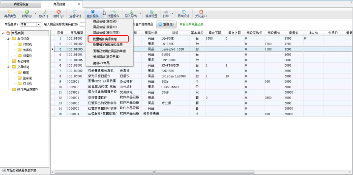在功能導(dǎo)航窗點(diǎn)擊“基礎(chǔ)資料”—》“商品信息”打開商品信息主界面,在工具欄點(diǎn)擊“更多操作”—》“批量維護(hù)商品信息”可以打開批量維護(hù)商品信息界面,如下圖一所示。