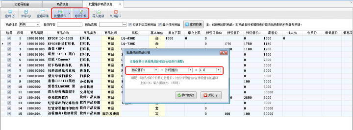在批量維護(hù)商品信息界面工具欄點(diǎn)擊“批量操作”按鈕可以進(jìn)入批量操作模式,可以復(fù)選多個需要調(diào)價的商品信息,然后在工具欄點(diǎn)擊“修改價格”按鈕打開“批量修改商品價格”窗口對已選擇的商品信息進(jìn)行批量調(diào)價,比如:預(yù)設(shè)售價2在預(yù)設(shè)售價的基礎(chǔ)上提價10%,可以設(shè)置為“預(yù)設(shè)售價2=預(yù)設(shè)售價*1.1”,如下圖二所示。