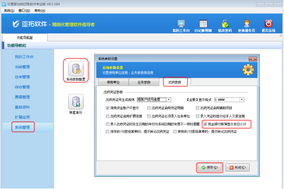 在功能導航窗點擊“系統管理”——》“系統參數配置”即可打開“系統參數設置”界面,點擊“出納參數”,系統默認勾選“現金銀行賬簿顯示本日小計”參數,如圖1所示。