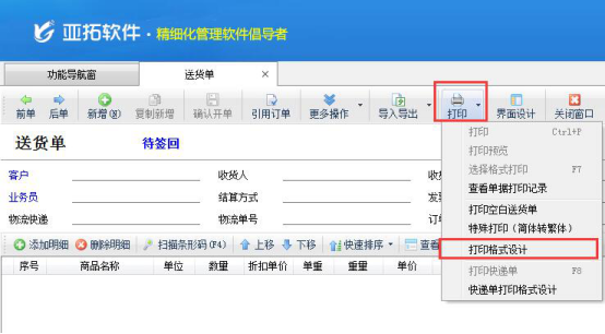 選擇導航欄的“業(yè)務(wù)處理”模塊,打開一個送貨單界面,選擇界面上的“打印”按鈕下的“打印格式設(shè)計”,進入打印格式設(shè)計界面,如下圖1 所示: