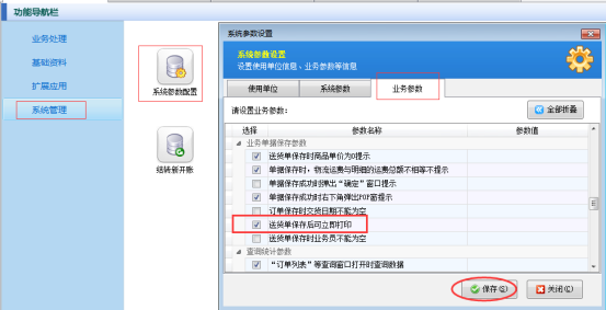 功能導(dǎo)航欄選擇“系統(tǒng)管理”—》“系統(tǒng)參數(shù)配置”—》“業(yè)務(wù)參數(shù)”,勾選上“送貨單保存后可立即打印”,配置完成后點擊“保存”按鈕保存配置,如下圖1所示:
