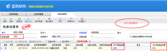 在“應收款管理”中選擇應收款,點擊“收款結算”進入收款結算單界面,本次結銷部分金額和收款金額輸入一致,點擊“保存”則應收款管理中狀態變為“部分結銷”,下次付余款可以繼續選擇“部分結銷”的應收款進行結銷操作。如下圖3所示: