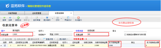 客戶結銷存在優惠金額,例如下圖應收款金額為13380元,優惠了380元,實付款13000元。在收款結算時,本次結銷金額依舊填寫“13380”收款金額填寫“13000”優惠金額輸入“380”,然后點擊“保存”應收款結算完成。如下圖4所示: