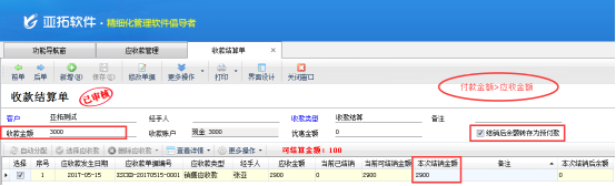客戶本次結銷金額大于其應收金額,可以在結銷應收款的時候,把多余的應收款轉存為客戶預付款,可以在下次結銷應收款時進行抵消應收款。例如下圖,客戶本次收款金額為2900元,實付款3000元。在“收款結算單”界面,本次結銷金額正常填寫當前可結銷金額2900元,收款金額填寫“3000元”,勾選上“結銷后余額轉存為預付款”,則結銷完成,在應收款管理界面會增加一個“客戶預付款”單據,如下圖5、圖6所示: