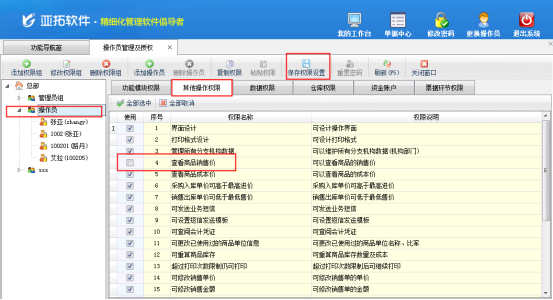 以亞拓管理軟件專業版本為例,首先打開系統管理—》操作員及授權,選擇一個操作員組,設置其他操作權限中的“查看商品銷售價”不勾選。然后保存權限。如下圖1所示: