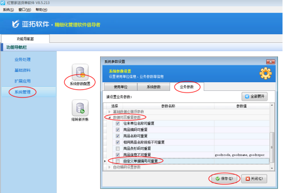 以紅管家送貨單軟件為例,在“系統(tǒng)管理”—》“系統(tǒng)參數(shù)配置”—》“業(yè)務(wù)參數(shù)”內(nèi)將“數(shù)據(jù)可否重復(fù)參數(shù)”中的“自定義單據(jù)編號(hào)可重復(fù)”參數(shù)的勾選取消,然后保存設(shè)置。如下圖1所示: