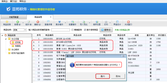 以圖1為例,商品類別是“商品類別”的一共有3條記錄,現在要把這3條記錄的商品類別改為“打印機”。首先點擊第2行記錄,然后按下Shift鍵不松手時鼠標點擊第4行記錄,這樣就可以同時快速選中第2行至第4行這3條記錄,選中多條記錄后,再按住鼠標左鍵不松手,移動到商品類別“打印機”處,此時系統會提示“是否要將當前選擇3個商品的類別設置為【打印機】?”,點“是”按鈕即可,如圖2所示。