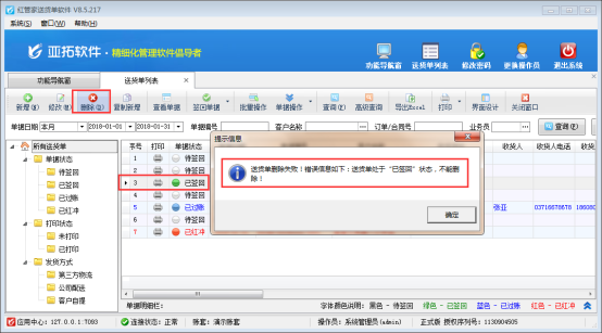 紅管家送貨單中內置了一個簡單的流程:待簽回(新開單)-》已簽回(業務員送貨回來或者客戶已簽收快遞)-》已過賬(財務確認已收到貨款),用戶可以單據變化選擇標記單據狀態,有時候會遇到需要刪除已簽回單據的情況。