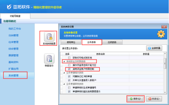 在功能導(dǎo)航窗選擇“系統(tǒng)管理”—》“系統(tǒng)參數(shù)配置”—》“業(yè)務(wù)參數(shù)”進(jìn)入業(yè)務(wù)參數(shù)配置界面,在系統(tǒng)安全及權(quán)限參數(shù)中勾選“啟用資金賬戶權(quán)限”參數(shù),如下圖1所示: