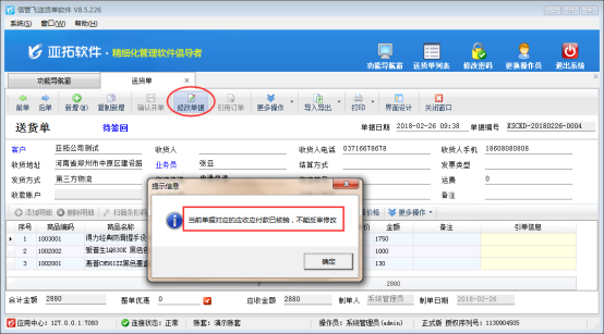 亞拓軟件自主開發的信管飛送貨單軟件亞拓管理軟件等都支持將送貨單(銷售單)進行收款結銷操作,有時可能存在送貨單商品明細開錯的情況。如果當前送貨單的應收款已結銷,軟件是不允許再修改此單據的,如下圖1所示: