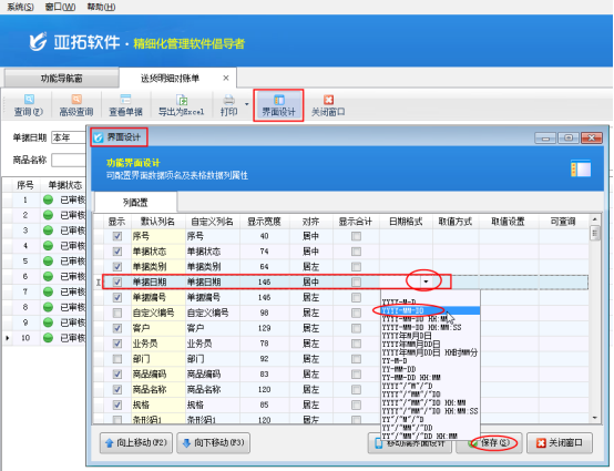 登錄軟件,在功能導(dǎo)航窗點(diǎn)“業(yè)務(wù)處理”,軟件最右側(cè)相關(guān)查詢統(tǒng)計(jì)中點(diǎn)擊“送貨明細(xì)對賬單”,即可進(jìn)入“送貨明細(xì)對賬單”界面,如圖2所示,點(diǎn)擊“界面設(shè)計(jì)”按鈕,系統(tǒng)彈出界面設(shè)計(jì)窗口,找到“單據(jù)日期”這個數(shù)據(jù)項(xiàng)后,對應(yīng)的日期格式選擇為“YYYY-MM-DD”。