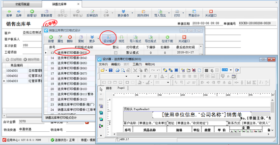 打開一個已保存的銷售出庫單單據,然后在單據界面點擊“打印”—“打印格式設計”按鈕,進入“銷售出庫單打印格式設計”界面,選擇需要調整的打印格式模版(B03),然后點擊“設計格式”按鈕進入模版設計器界面,如下圖二所示。