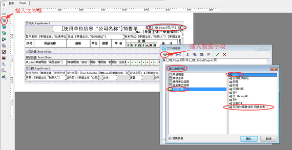 打開模版設計界面后,在模版合適的位置添加一個文本框,雙擊文本框打開文本編輯器,然后錄入內容“第[_RM_Page]頁/共[_RM_TotalPages]頁”或者是通過“插入數據字段”插入頁碼,如下圖三、圖四所示。