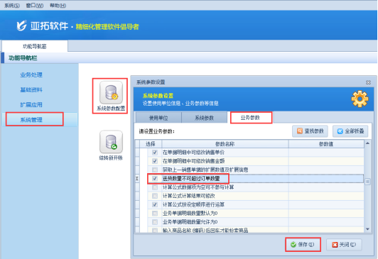 在功能導(dǎo)航窗選擇“系統(tǒng)管理”—》“系統(tǒng)參數(shù)配置”—》“業(yè)務(wù)參數(shù)”,進(jìn)入到業(yè)務(wù)參數(shù)配置界面,勾選上“送貨數(shù)量不可超過(guò)訂單數(shù)量”參數(shù),然后點(diǎn)擊“保存”按鈕保存設(shè)置,如下圖1所示: