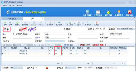 參數(shù)設(shè)置完成后,在功能導(dǎo)航窗點(diǎn)擊“業(yè)務(wù)處理”—》“新開(kāi)訂單”,新增訂單,訂單內(nèi)容錄入兩條數(shù)量為“50”的商品,然后保存審核訂單,如下圖2所示:
