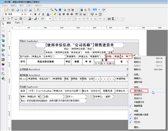 在開好的單據(jù)界面點(diǎn)擊“打印”—》“打印格式設(shè)計(jì)”—》“設(shè)計(jì)格式”,進(jìn)入打印模板設(shè)計(jì)器界面,選擇單據(jù)日期文本框,鼠標(biāo)右鍵選擇“顯示格式”,如圖2所示。