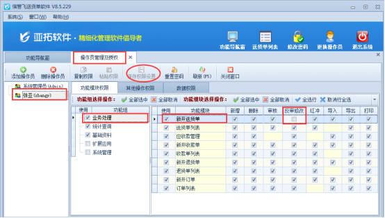 亞拓管理軟件(星光版、標準版、專業(yè)版)、信管飛送貨單軟件、信管飛倉庫管理軟件都支持新增操作員進行設(shè)置操作員權(quán)限。對于業(yè)務單據(jù),部分用戶設(shè)置操作員及權(quán)限時不允許操作員有修改單據(jù)的權(quán)限。