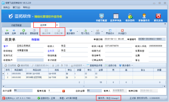 權(quán)限設(shè)置完成后,關(guān)閉當前權(quán)限設(shè)置窗口,點擊界面右上角“更換操作員”,可快速切換到登錄軟件界面。選擇操作員“張亞”登錄軟件。打開一個已保存的送貨單,可以看到工具欄中沒有“修改單據(jù)”按鈕,如下圖2所示: