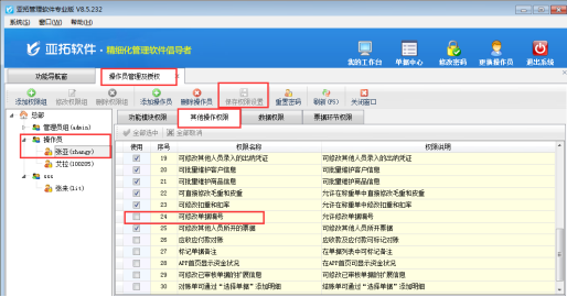 以亞拓管理軟件專業(yè)版為例,示范下如何設置操作員不能修改單據(jù)編號的權(quán)限。在功能導航窗選擇“系統(tǒng)管理”—》“操作員及授權(quán)”進入操作員管理及授權(quán)界面。選擇操作員組的操作員“張亞”,點擊右側(cè)功能權(quán)限設置模塊,點擊“其他操作權(quán)限”,在下邊的權(quán)限中找到“可修改單據(jù)編號”,把勾選“√”符號取消(鼠標單擊即可取消)。點擊保存權(quán)限設置。如下圖1所示:
