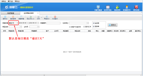 信管飛送貨單軟件、信管飛RMS(進(jìn)銷存軟件)、信管飛倉庫管理軟件內(nèi)都包含了統(tǒng)計(jì)查詢功能(單據(jù)匯總表、單據(jù)明細(xì)表等統(tǒng)計(jì)查詢報(bào)表),軟件內(nèi)統(tǒng)計(jì)查詢功能默認(rèn)的查詢?nèi)掌跒椤白罱?天”(如下圖1所示),但是如果需要修改默認(rèn)查詢?nèi)掌,該如何修改呢?下面我們?A title="" href="http://m.hzyouth.org.cn/tools/songhuo.html">信管飛送貨單軟件為例詳細(xì)介紹下軟件內(nèi)如何修改默認(rèn)查詢?nèi)掌凇?/P>