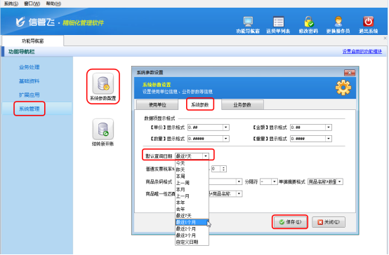 在功能導(dǎo)航窗點(diǎn)擊“系統(tǒng)管理”——》“系統(tǒng)參數(shù)配置”——》“系統(tǒng)參數(shù)”,在“系統(tǒng)參數(shù)”界面可以修改“默認(rèn)查詢?nèi)掌凇保ㄟ@里修改為“最近1個(gè)月”),修改完成之后點(diǎn)擊“保存”按鈕保存配置。