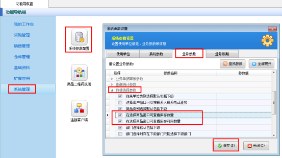 在功能導航窗,點擊“系統管理”—》“系統參數配置”—》“業務參數”,選擇“數據選擇參數”進行設置,勾選參數“在選擇商品窗口可查看庫存數量”及“在選擇商品窗口可查看庫存可用數量”,然后保存,如圖1所示。
