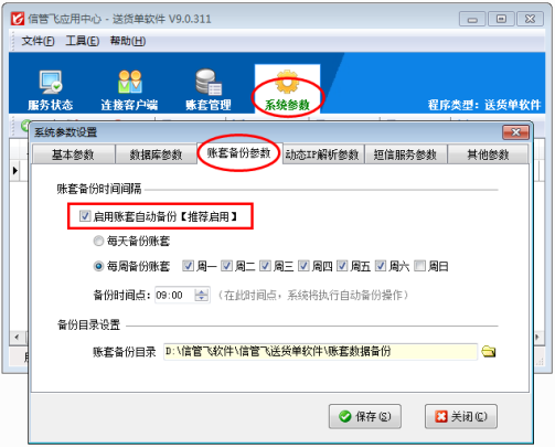 信管飛送貨單軟件信管飛RMS信管飛出納記賬軟件信管飛倉庫管理軟件信管飛票據軟件都支持設置賬套自動備份,我們強烈建議啟用自動備份功能,以便賬套出現問題的時候從賬套備份文件中恢復數據。下面我們以信管飛送貨單軟件為例詳細介紹一下如何啟用賬套自動備份功能?