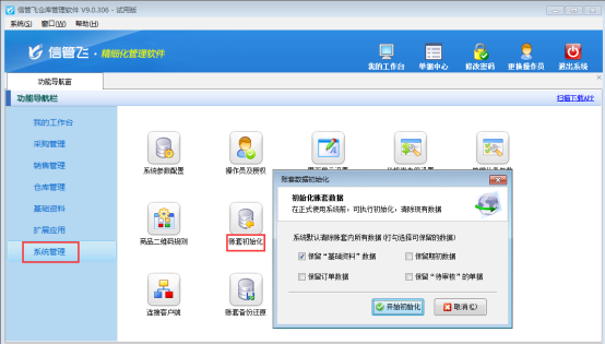 信管飛倉庫管理軟件信管飛RMS信管飛送貨單軟件等都支持對賬套進行初始化操作,下邊以“信管飛倉庫管理軟件”為例來演示下具體的操作步驟。