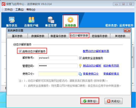 動態(tài)IP解析服務(wù)屬于增值服務(wù),使用需要另外進行購買,購買后會分配解析賬號、管理密碼和使用口令信息,首先需要配置主機電腦(插入加密鎖的電腦),在主機電腦上打開應(yīng)用中心程序(紅色圖標),點擊“系統(tǒng)參數(shù)”,在系統(tǒng)參數(shù)設(shè)置界面,選擇“動態(tài)IP解析參數(shù)”,在此界面勾選啟用“動態(tài)IP解析服務(wù)”,把分配的解析賬號和管理密碼復(fù)制其中,點擊保存即可(可以點擊測試動態(tài)IP解析進行測試是否注冊),如下圖1所示:
