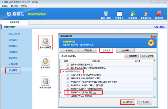 登錄軟件,在功能導(dǎo)航窗點(diǎn)擊“系統(tǒng)管理”—》“系統(tǒng)參數(shù)配置”—》“業(yè)務(wù)參數(shù)”可以進(jìn)入“業(yè)務(wù)參數(shù)”配置界面,在業(yè)務(wù)單據(jù)保存參數(shù)內(nèi)打勾啟用“訂單保存時(shí)交貨日期不能為空”參數(shù),如下圖1所示。