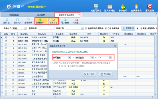 在批量維護(hù)商品信息界面,修改價(jià)格需要在批量模式下進(jìn)行操作。點(diǎn)擊“批量操作”按鈕進(jìn)入批量操作模式,可以勾選部分商品或者全選商品進(jìn)行修改,本次勾選商品“EPSON LQ-630K、EPSON針式打印機(jī)”為例,勾選后點(diǎn)擊修改價(jià)格,彈出“批量修改價(jià)格”界面,修改此商品的預(yù)設(shè)售價(jià)=預(yù)設(shè)售價(jià)*1.5,如下圖2所示:
