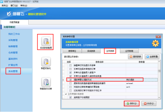 以信管飛倉庫管理軟件為例,首先設置參數,在導航窗“系統管理”—》“系統參數配置”—》選擇“業務參數”的“調撥單默認調撥方式”,后邊的參數值可選擇同價調撥或者變價調撥(示例選擇同價調撥)。勾選上此參數保存即可。如下圖所示:
