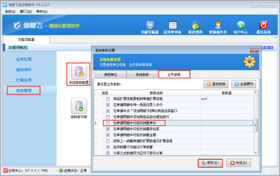 以“信管飛送貨單軟件”為例,示范如何設置開單時單價不允許修改,在功能導航窗選擇“系統管理”—》“系統參數配置”—》“業務參數”,在業務單據明細參數中。把參數“在單據明細中可修改銷售單價”前的勾選取消,然后保存配置。如下圖1所示: