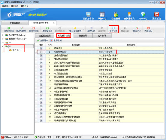 以信管飛倉庫管理軟件為例,介紹一下如何控制操作員的打印模板設計權限。在功能導航窗,選擇“系統管理”—》“操作員及授權”,選擇操作員“張三”,然后在“其他操作權限”中把“打印格式設計”權限前的勾選符號取消,然后點擊“保存設置”,如下圖1所示: