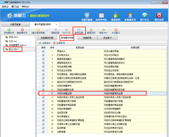 信管飛送貨單軟件信管飛RMS信管飛倉庫管理軟件等默認開單時金額信息允許修改,為了避免操作員開單時出現金額修改錯誤情況,軟件支持設置操作員不可修改銷售金額的權限。以“信管飛送貨單軟件”為例,講一下如何設置操作員不可修改銷售金額。