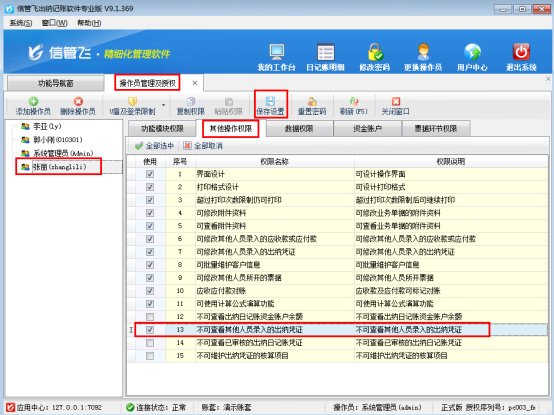 信管飛出納記賬軟件信管飛RMS標(biāo)準(zhǔn)版和專(zhuān)業(yè)版都支持設(shè)置操作員不可查看其他人員錄入的出納憑證的權(quán)限,本篇文章以信管飛出納記賬軟件專(zhuān)業(yè)版為例詳細(xì)介紹一下如何設(shè)置操作員不可查看其他人員錄入的出納憑證。