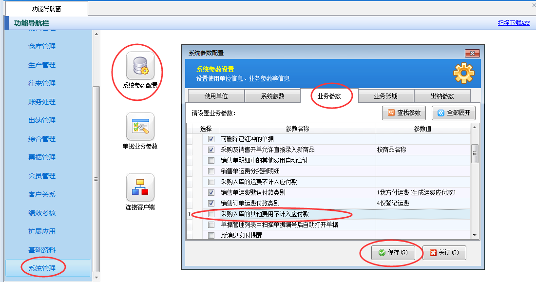 在功能導(dǎo)航窗點(diǎn)擊“系統(tǒng)管理”—》“系統(tǒng)參數(shù)配置”—》“業(yè)務(wù)參數(shù)”,即可進(jìn)入到“業(yè)務(wù)參數(shù)”配置界面,在業(yè)務(wù)單據(jù)相關(guān)參數(shù)內(nèi)將“采購入庫的運(yùn)費(fèi)不計入應(yīng)付款”參數(shù)的勾選取消,設(shè)置完成后點(diǎn)擊“保存”按鈕保存配置,如下圖一所示。
