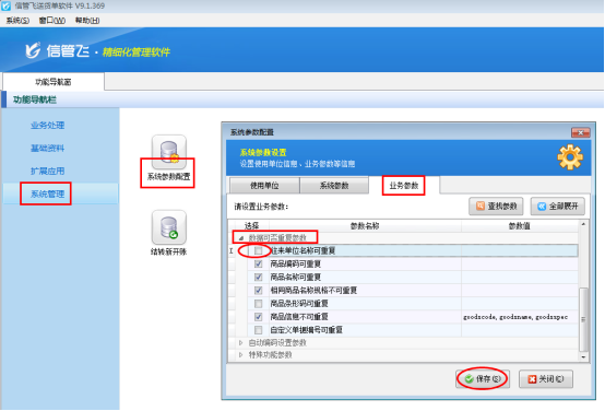 登錄軟件,在“系統管理”—》“系統參數配置”—》“業務參數”中的“數據可否重復參數”把“往來單位名稱可重復”的勾選符號取消,然后保存設置。如下圖所示:
