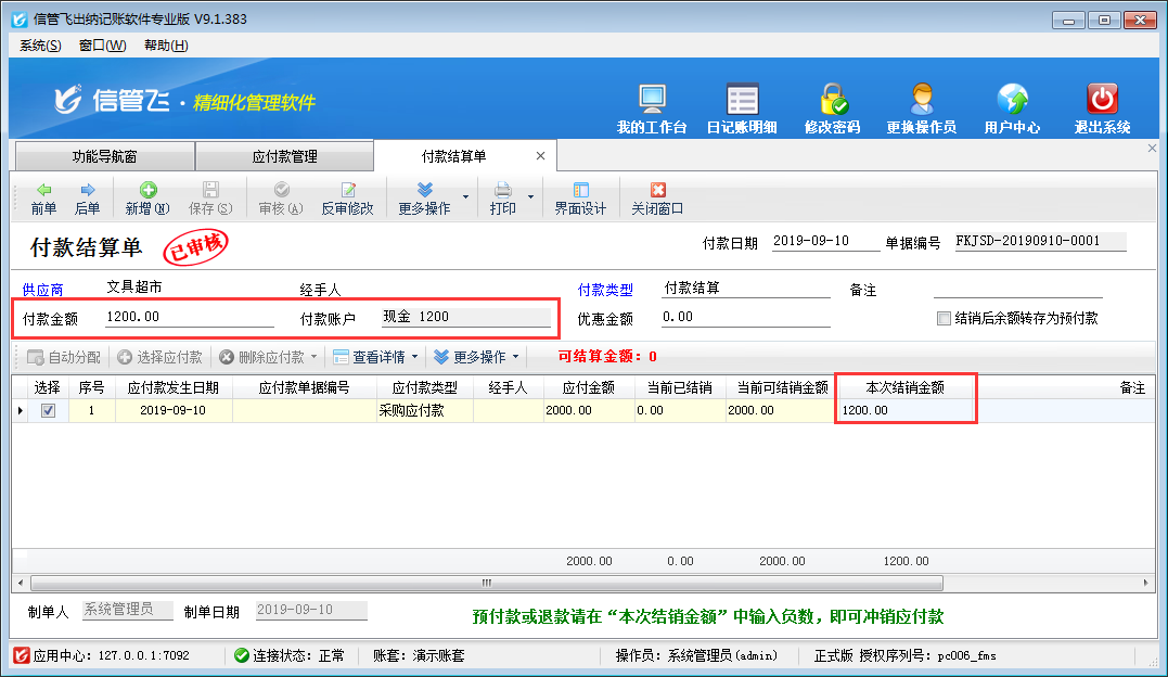 注意:付款結(jié)算單單據(jù)明細中“本次結(jié)銷金額”的合計金額,必須等于可結(jié)銷金額(付款金額 + 優(yōu)惠金額),否則無法保存付款結(jié)算單。
