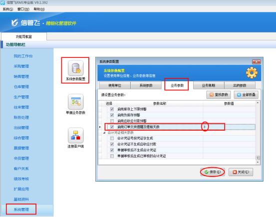 在功能導航窗點擊“系統(tǒng)管理”—》“系統(tǒng)參數(shù)配置”—》“業(yè)務(wù)參數(shù)”,打勾“啟用訂單交貨提醒及提前天數(shù)”,在參數(shù)值內(nèi)可以錄入需要提前的天數(shù),再保存設(shè)置,如下圖所示: