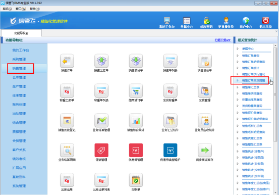 在功能導航窗點擊“銷售管理”,銷售管理模塊最右側(cè)相關(guān)查詢統(tǒng)計內(nèi)打開“銷售訂單交貨提醒”,如下圖所示: