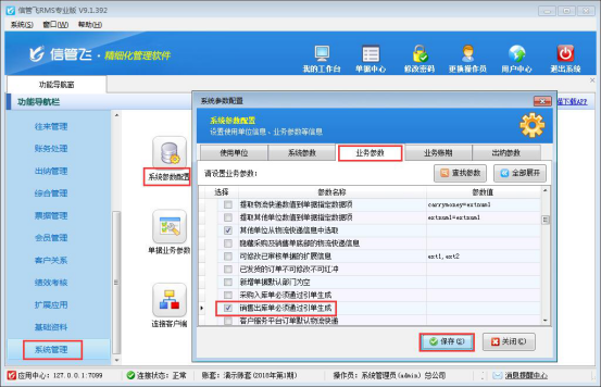 本文以“信管飛RMS專(zhuān)業(yè)版”為例,示范如何設(shè)置銷(xiāo)售出庫(kù)單只能通過(guò)引單生成。在功能導(dǎo)航窗選擇“系統(tǒng)管理”—》“系統(tǒng)參數(shù)配置”在業(yè)務(wù)參數(shù)的“業(yè)務(wù)單據(jù)相關(guān)參數(shù)”中勾選啟用參數(shù)“銷(xiāo)售出庫(kù)單必須通過(guò)引單生成”,保存參數(shù)配置,如下所示: